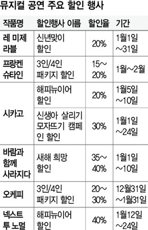 29일 뮤지컬 제작사들의 말을 종합하면, 2016년 1월에 접어들면서 1000석 이상 대극장 공연들이 일제히 20~30% 이상의 할인행사를 시작한다. 이는 매년 12월이 공연계의 연중 최고 성수기인 탓에 할인행사가 거의 없는 것과 대조적이다. 이를테면 인터파크 월간 랭킹에서 1위 자리에 올라 있는 <레 미제라블>은 ‘신년맞이 할인’이라는 이름으로 1월 한 달 동안 푯값의 20%를 할인해 준다. <시카고>도 같은 기간 20~30% 할인에 들어간다. (표 참고)
