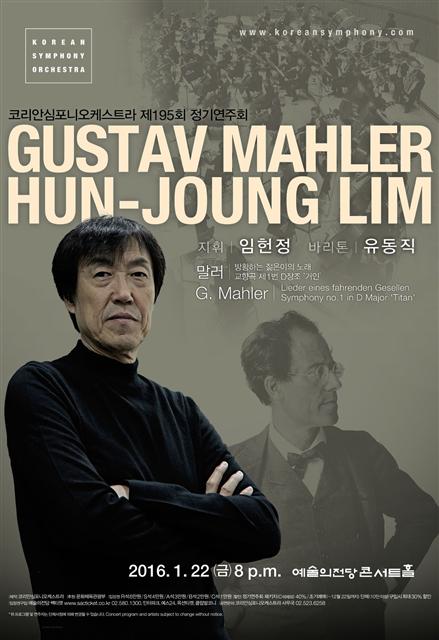 ‘말러 스페셜리스트’ 임헌정이 이끄는 코리안심포니오케스트라가 2016년 첫 정기연주회를 말러 교향곡 1번 ‘거인’으로 연다. ‘거인’은 그의 20대 시절의 서정성이 짙게 밴 곡이다. 전반부에서는 바리톤 유동직이 말러 가곡집 <방황하는 젊은이의 노래>를 들려준다. 오는 22일 저녁 8시 서울 예술의전당 콘서트홀. (02)580-1300.