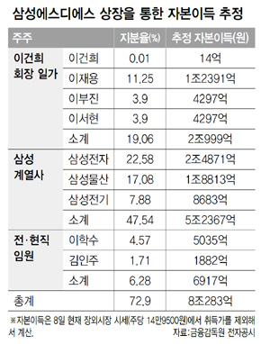 삼성에스디에스 상장이 투자재원 확보를 목적으로 한 것이라고는 하지만, 이건희 회장 일가와 삼성 계열사 등 주주들은 막대한 자본이득을 얻게 됐다. 삼성에스디에스 주식은 상장 발표 전날인 7일 장외시장에서 주당 14만9500원에 거래됐다. 이건희 회장 일가의 삼성에스디에스 주식 인수가인 7150원의 20배다. 삼성에스디에스 주식 19.1%(1475만주)를 보유한 이건희 회장 일가의 총 자본이득은 최소 2조1000억원에 달한다. 최대 수혜자는 11.25%의 지분을 보유한 이재용 삼성전자 부회장으로, 예상 자본이득은 최소 1조2000억원을 넘는다. 여동생인 이부진 호텔신라 사장과 이서현 제일기획 사장도 3.9%씩 지분을 보유하고 있어 예상 자본이득이 각각 4000억원을 넘는다. 삼성전자(지분 22.6%), 삼성물산(17.1%), 삼성전기(7.9%) 등 계열사의 자본이득도 5조2000억원을 넘는다. 전·현직 임원인 이학수 전 부회장(지분 4.57%), 김인주 삼성선물 사장(1.71%)도 각각 5035억원과 1882억원의 자본이득이 기대된다. 상장 소식이 알려지면서 장외시장 주가가 폭등해 자본이득 규모는 더 커질 가능성이 높다. 경제계는 삼성에스디에스 상장이 삼성의 3세 경영승계에 끼칠 영향에도 주목한다. 이재용 부회장 등 이건희 회장 자녀들의 경영승계에 가장 큰 걸림돌은 삼성전자·삼성물산·호텔신라·제일기획 등 핵심 계열사들의 지분이 극히 낮거나 아예 없다는 점이다. 이 부회장 등은 상장 이후 3세 승계가 본격화하는 시점에 삼성에스디에스 주식을 내다팔아 자금을 마련한 뒤 핵심 계열사의 지분 확보와, 이건희 회장 부부가 가진 삼성전자(4.22%), 삼성생명(20.76%) 주식을 물려받는 데 필요한 상속세 납부에 사용할 것으로 예상된다. 이 부회장이 1조원이 넘는 자본이득을 모두 삼성전자 지분 확보에 쓴다고 가정하면, 이날 주가 기준으로 0.6% 정도의 지분 확보가 가능하다. 이는 이 부회장이 현재 갖고 있는 삼성전자 지분 0.57%보다 많다. 삼성이 지난해 10월 삼성에스엔에스를 삼성에스디에스와 합병한 것도 상장을 염두에 둔 사전포석으로 해석된다. 삼성에스엔에스의 대주주였던 이 부회장은 합병 이후 삼성에스디에스 지분이 8.81%에서 11.25%로 뛰었다. 이건희 회장 일가의 자본이득은 1999년 삼성에스디에스 신주인수권부사채 헐값 인수를 통해 얻은 것이어서 논란이 예상된다. 삼성에스디에스 사건은 삼성에버랜드 전환사채 발행 사건과 함께 삼성의 불법적 경영권 승계 논란의 핵심이다. 이건희 회장 일가의 삼성에스디에스 주식 인수가격(주당 7150원)은 당시 장외시장 실거래인 5만5000원의 8분의 1에 불과한 헐값이었다. 이에 대해 대법원은 2009년 5월 배임 혐의로 유죄를 확정했다. 재판 과정에서 그룹 미래전략실이 이건희 회장에게 헐값발행을 사전보고한 사실이 드러나기도 했다. 김상조 경제개혁연대 소장은 “삼성에스디에스 헐값발행에 따른 사법적 판단은 끝났지만, 이건희 회장 일가가 2조원 이상의 ‘부당이득 수혜자’라는 꼬리표까지 사라진 것은 아니다. 향후 경영승계 과정에서 이를 해소할 방안을 내놔야 한다”고 말했다. 이에 대해 삼성 미래전략실은 법에 따라 이미 (증여세 납부, 삼성에스디에스 손실 배상, 배임죄 처벌 등) 소정의 조처를 취했다고 말해, 일부 자본이득의 사회환원 등 별도 조처를 취할 계획이 없음을 밝혔다. 곽정수 선임기자 jskwak@hani.co.kr