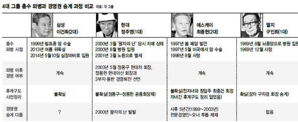 삼성·현대·에스케이·엘지 등 4대 그룹이 총수의 와병 이후 경영 승계 과정에서 겪은 경험을 비교한 결과 공통점은 모든 총수들이 건강 악화에도 불구하고 끝까지 경영일선에서 물러나지 않은 것이었다. 삼성 이 회장은 1999년 림프절 암 진단 이후 지속적으로 건강이상설에 휩싸였고, 지난해 여름에는 한때 위독설이 돌기도 했다. 하지만 2008년 삼성 비자금 사건으로 경영에서 물러난 지 2년 만인 2010년 다시 복귀한 이후 출근 횟수를 늘리는 등 경영에 더 매진했다.