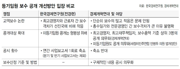 이는 경제개혁연대가 최근 미국과 같이 등기임원 여부와 무관하게 최고경영자, 최고재무책임자, 보수총액 기준 상위 3명을 의무적으로 공개하고, 보수액 뿐만 아니라 구체적인 보수산정 기준과 방법도 함께 공시할 것을 요구한 것과 배치된다. 새정치민주연합의 민병두 의원 등 야당 의원들도 미등기임원을 보수공개 대상에 포함시키는 자본시장법 개정안을 국회에 제출해놓고 있다.