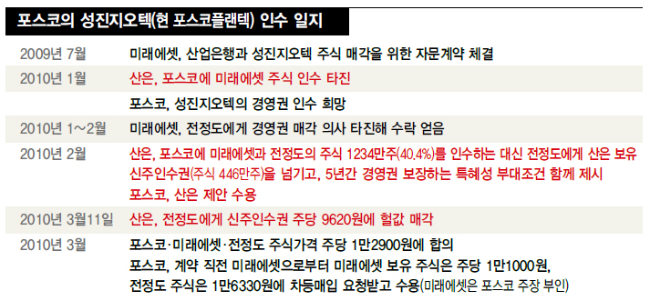 27일 포스코·산업은행·미래에셋의 말을 종합하면, 산은은 2010년 2월 말 포스코에 전씨와 미래에셋이 보유한 성진지오텍 주식 1234만주(40.4%)의 인수안을 제시하며, 산은이 보유 중인 성진지오텍 주식 446만주를 전씨에게 팔고, 5년간 경영권을 보장하는 부대조건을 함께 내놓았다. 포스코가 이를 수용하면서, 3월11일 산은은 전씨에게 신주인수권을 주당 9620원에 팔았고, 3월17일 포스코는 전씨의 주식을 주당 1만1000원에, 미래에셋이 보유한 주식은 주당 1만6330원에 인수했다. 산은 홍보실은 “미래에셋과 성진지오텍 주식 매각 자문 계약을 맺고 2010년 1월 포스코에 주식 매입 의사를 타진했는데, 포스코가 경영권 인수에 관심을 보여, 미래에셋의 유정헌 대표가 전씨를 만나 보유 지분 중 일부와 경영권을 포스코에 팔 것을 제안했다”며 “전씨가 유 대표의 권유를 수용하며 부대조건을 제시해, 포스코에 전달했다”고 밝혔다.