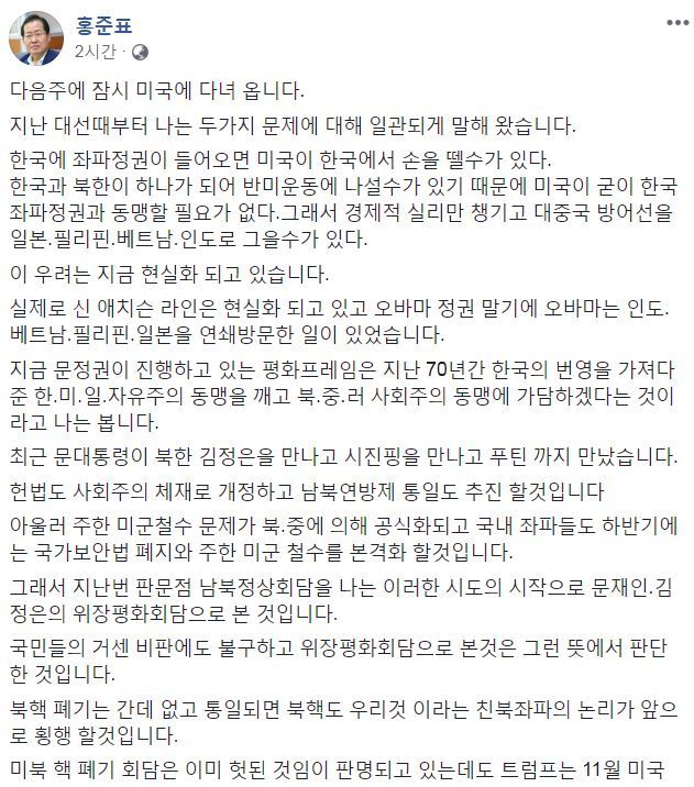 홍 전 대표는 “문(재인) 정권이 진행하고 있는 평화프레임은 지난 70년간 한국의 번영을 가져다준 한·미·일 자유주의 동맹을 깨고 북·중·러 사회주의 동맹에 가담하겠다는 것”이라며 “문 대통령이 북한 김정은을 만나고 시진핑을 만나고 푸틴까지 만났다. 헌법도 사회주의 체제로 개정하고 남북연방제 통일도 추진 할 것”이라고 밝혔다. 이어 “주한 미군철수 문제가 북·중에 의해 공식화되고 국내 좌파들도 하반기에는 국가보안법 폐지와 주한 미군철수를 본격화할 것”이라며 “국민들의 거센 비판에도 위장평화회담으로 본 것은 그런 뜻에서 판단한 것”이라고 밝혔다. 또 “평화프레임의 본질이 이런 것으로 밝혀져도 국민들이 과연 동의할까요?”라며 “이러한 의문을 갖고 이를 풀어보기 위해 잠시 방미한다”고 했다.