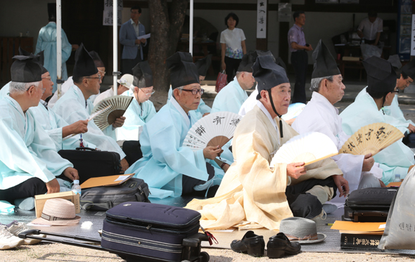 유건과 도포를 차려입은 어르신들이 21일 오전 서울 종로구 운현궁에서 열린 ‘21회 전국 한시 백일장’에 참가해 부채질로 더위를 식히며 한시를 짓고 있다.